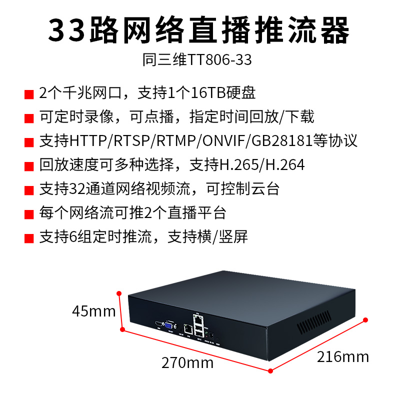 TT806-33推流器是一款专业的33路网络推流产品,双千M网口,双核心1.2G,mips架构CPU, 256MB内存,产品上带1个HDMI口+1个VGA口+1个3.5音频口+2个USB口(都是预留口,没开放),1个RJ45网口,支持1个16TB硬盘,可支持定时录像,可点播,录像可指定时间回放/下载,回放速度可多种选择,支持RTSP/ONVIF等局域网监控、其它IP-CAMERA视频或其它网络流转RTMP互联网直播,也可转GB-28181公安网络,支持输入协议:RTSP/RTMP/RTP/UDP-TS/HTTP-FLV,支持输出协议:HTTP-FLV/RTSP/RTMP/WS-FLV/WS-RAW/ONVIF/GB28181,支持高清1080P,输出输出编码格式都支持H.265/H.264,单路网络视频最大带宽为20M,最大总带宽是60M,可同时支持33路网络视频流,33路网络摄像头云台都可单独控制,每个网络视频流可推2个直播平台,可设置6组定时推流,支持推流到国内外各大直播平台,如抖鱼/视频号/YY/目睹/腾讯云/阿里云等,可兼容海康、大华、中维、雄迈等各种品牌摄像头,可本地见面H5播放,也可支持互联网远程控制和访问。