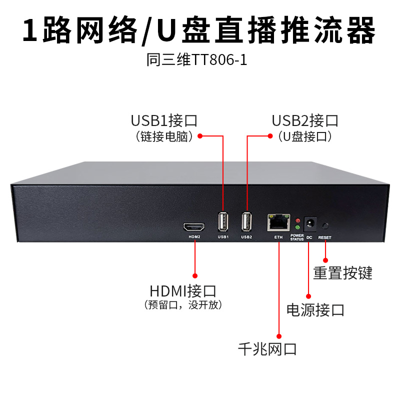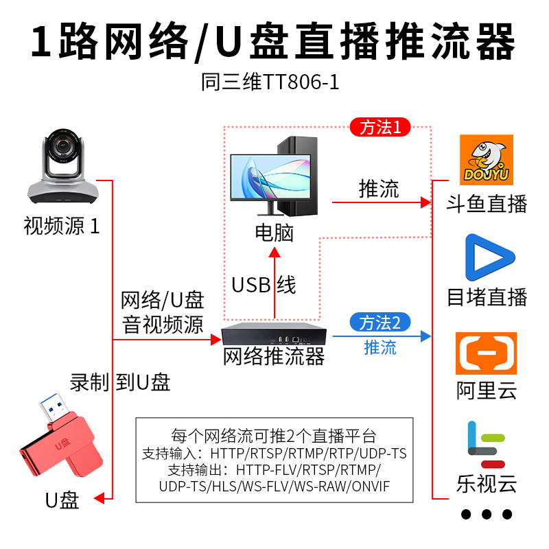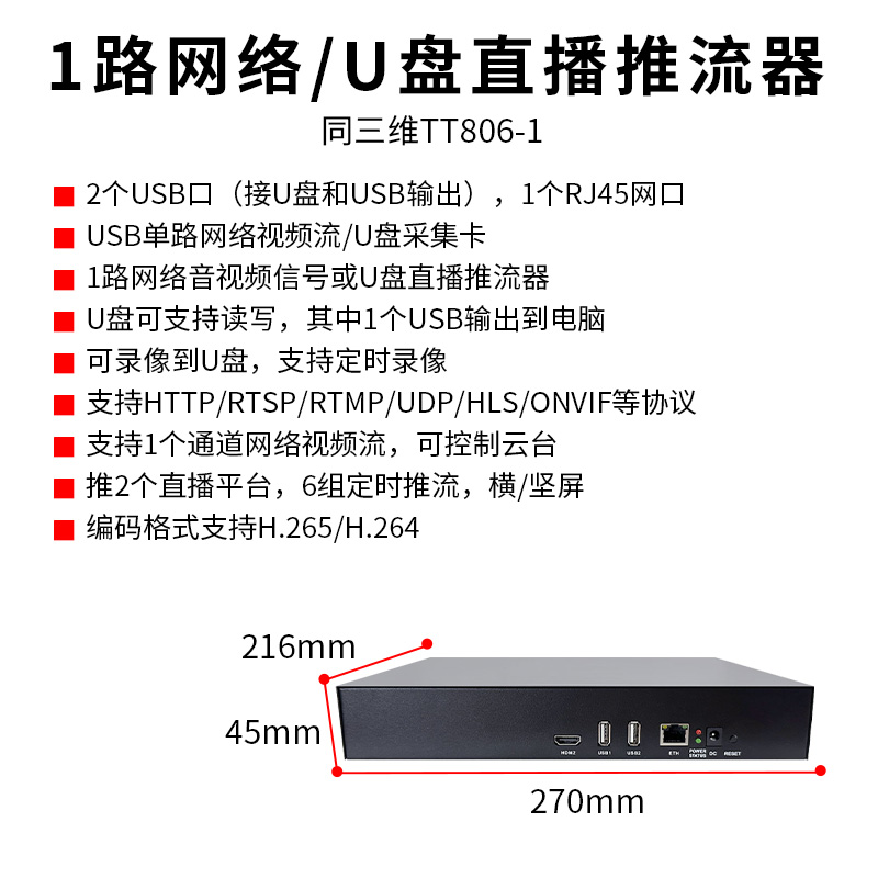 TT806-1推流器是一款专业的1路网络直播推流产品,也是一款USB单路网络音视频流/U盘采集卡,USB输出电脑,可把1路网络音视频流或U盘音视频信号推流直播出去,或通过USB输出到电脑里,通过快手或抖鱼软件直播出去,产品上带1个HDMI口(预留口,没开放)+2个USB口(第1个是USB接电脑,第2个接U盘,1个RJ45网口,可支持定时录像,可点播,录像可指定时间回放/下载,回放速度可多种选择,支持RTSP/ONVIF等局域网监控、其它IP-CAMERA视频或其它网络流转RTMP互联网直播,也可转GB-28181公安网络,支持输入协议:HTTP/RTSP/RTMP/RTP/UDP-TS,支持输出协议:HTTP-FLV/RTSP/RTMP/UDP-TS/HLS/WS-FLV/WS-RAW/ONVIF,支持高清1080P,输出输出编码格式都支持H.265/H.264,网络摄像头云台可控制,网络视频流可推2个直播平台,可设置6组定时推流,支持推流到国内外各大直播平台,如抖鱼/视频号/YY/目睹/腾讯云/阿里云等,可兼容海康、大华、中维、雄迈等各种品牌摄像头,可本地见面H5播放,也可支持互联网远程控制和访问。适合无人值守网络直播等应用。