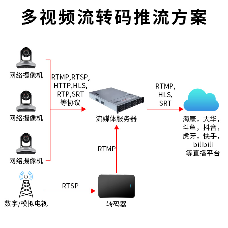 支持目前市面上各类前端摄像设备接入,包括:视频编码器、网络摄像机、单反相机、专业摄像机、录播主机、网络导播台等, 同时也支持各类电脑/手机推流软件。