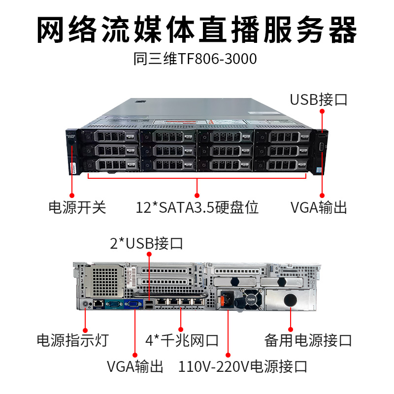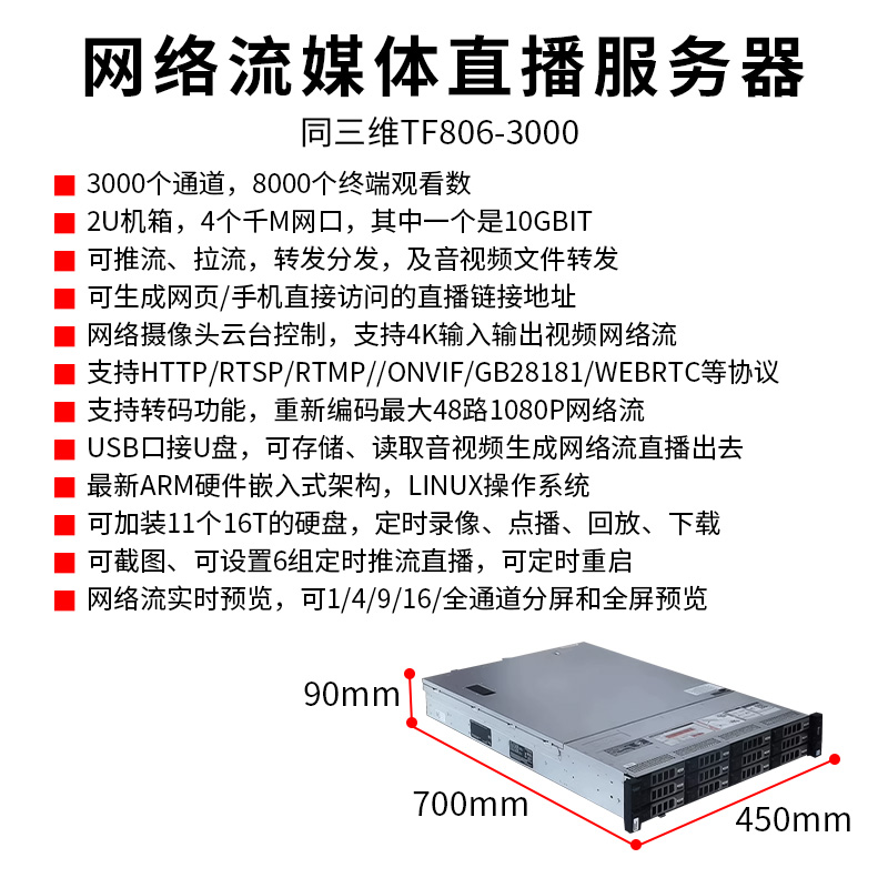 TF806-3000网络流媒体服务器是采用最新ARM硬件嵌入式架构,Liux操作系统,是一款高性能、高可靠、高并发的流媒体服务器,支持多协议多格式的视频流分发,低成本解决流媒体系统分发应用场景。该款服务器支持3000个网络视频通道,最大观看终端8000个,最大48路1080p重新编码,2U机箱,4个千M网口,其中一个是10Gbit,8000个并发,总和带宽8000M,可把U盘、硬盘等视频内容生成网络流直播出去,支持局域网内生成网页/手机直接访问观看的链接,外网可支持几个点的观看访问的WEBRTC协议链接,支持转码功能,重新编码最大48路1080p网络流,支持4K输入输出视频网络流,支持网络摄像头云台控制,可加装11个16T的硬盘,可定时录像,可点播,录像可指定时间回放/下载,回放速度可多种选择,可设置6组定时推流。