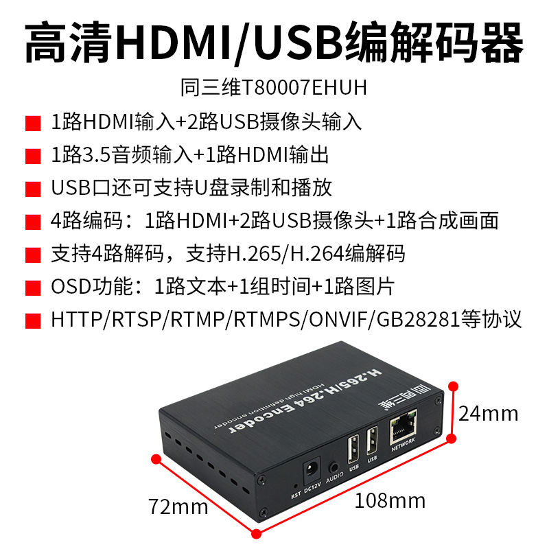 高清1080P,1路HDMI输入+1路3.5音频输入,2个USB口,可2路USB摄像头输入,USB口也可以接U盘录制或播放,同时支持1路合成画面编码,支持四路网络流解码,1路HDMI输出,H.265/H.264编码。