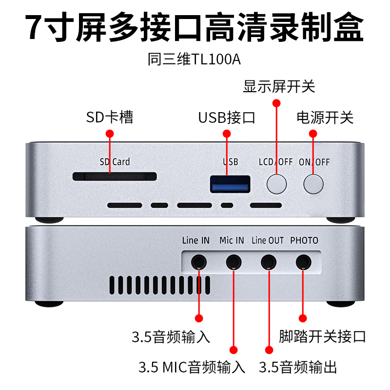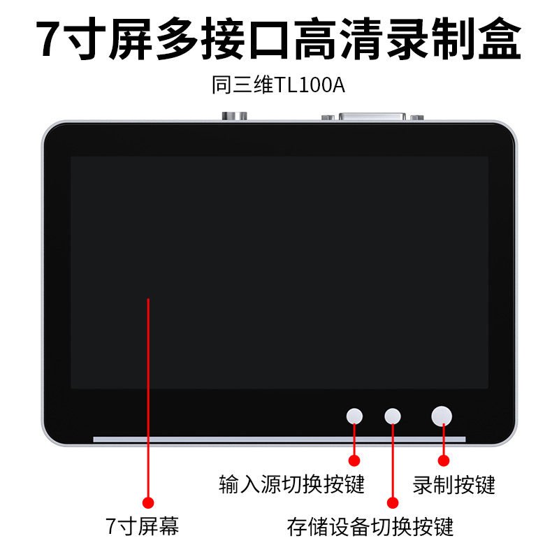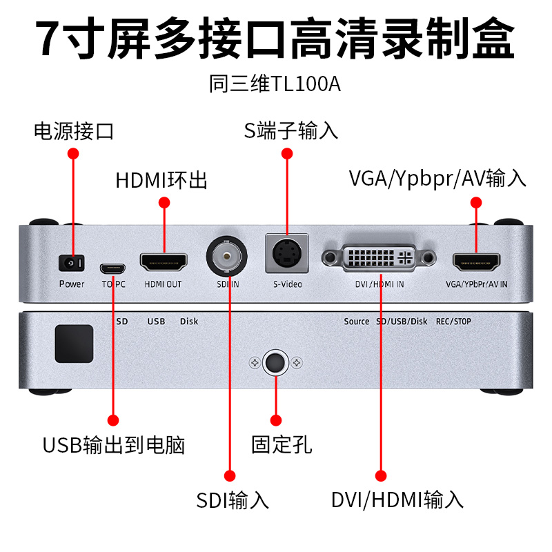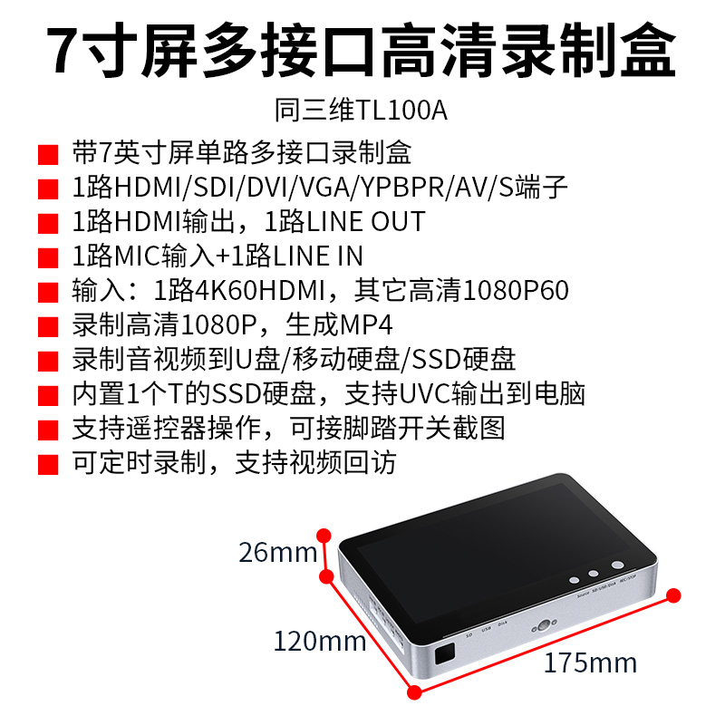同三维TL100A 单路全接口录制盒带7英寸屏,1路HDMI/SDI/DVI/VGA/YPBPR/AV/S端子信号输入,1路HDMI输出,1路MIC+1路LINE IN,1路LINE OUT, 1个接口(接脚踏开关),一个USB3.0口(接U盘/移动硬盘),1个SD卡槽,内置1T的SSD硬盘,可录制音视频到U盘/移动硬盘/内置SSD硬盘/SD卡,生存MP4文件,支持1路4K60HDMI输入,其它信号支持高清1080P60输入,录制高清1080P。支持遥控器操作,可定时录制。支持视频回放,支持UVC输出到电脑。
