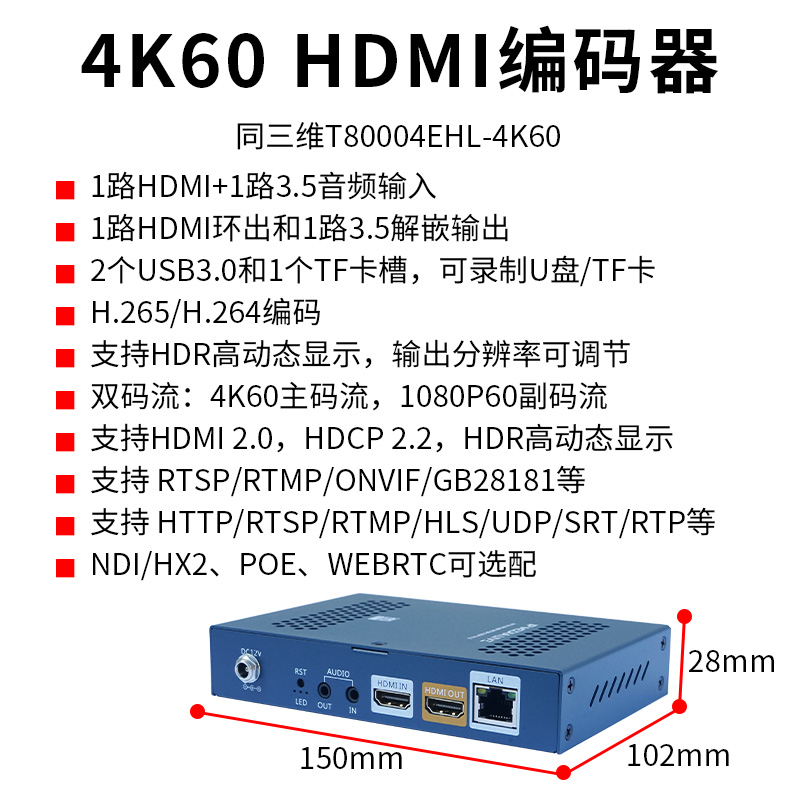 1路HDMI输入和1路HDMI环出,1路音频输入和1路音频输出,2个USB3.0和一个TF卡槽,支持4K60输入和编码,同时支持HDR高动态显示,输出分辨率可调节,NDI/HX2、POE、WEBRTC可选配
