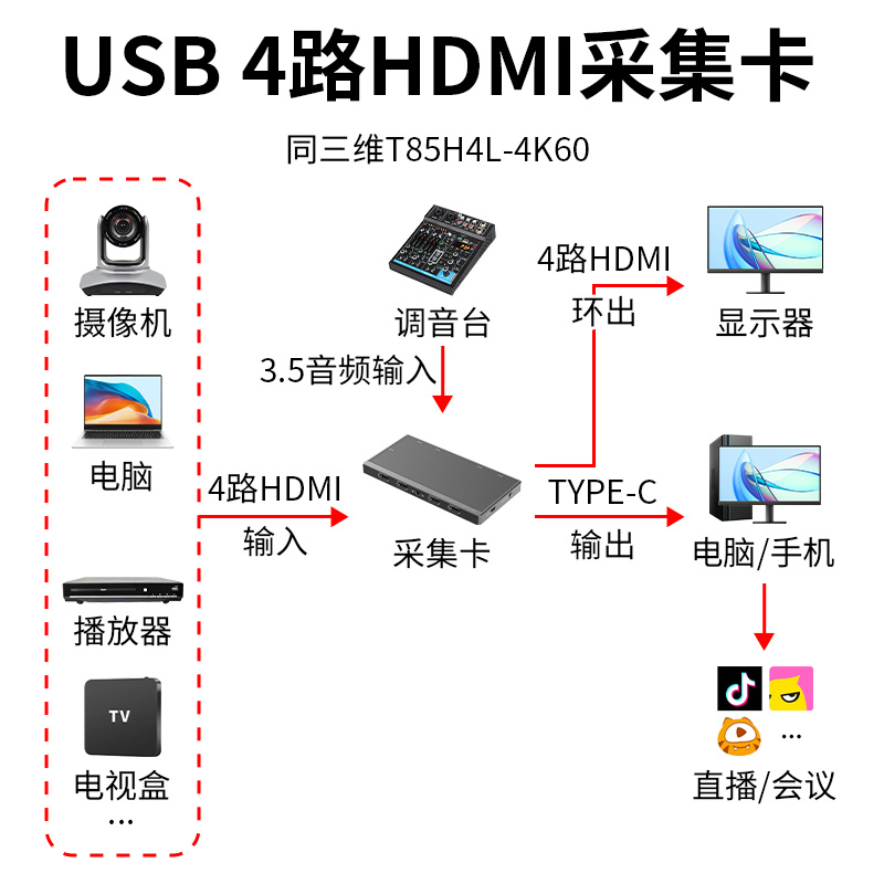 基于标准UVC协议免驱动,确保在多种设备上无缝运行,轻松采集并切换4路高清音视频信号,满足直播、会议、教学等场景需求。