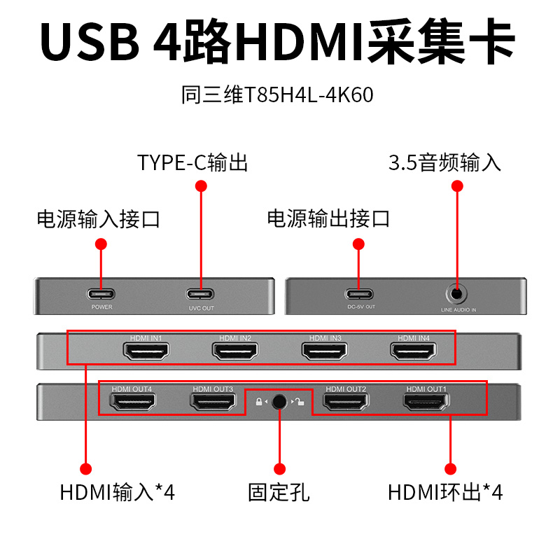 4路HDMI输入和环出,支持4K60 输入、环出和采集,1路3.5音频输入,HDMI1内嵌音频和1路3.5音频二选一,采集支持4096*2160@60Hz(MJPEG)、3840*2160@30Hz (YUV420) ,1个PD快充:PD快充协议100W,手机或电脑供电,短时间使用,可不供电,1个DC 5V/2A电源输出,供电给外部设备