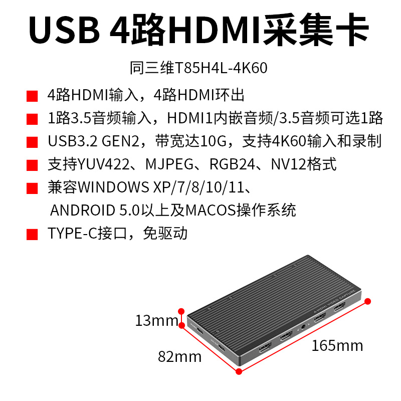 同三维T85H4L-4K60 USB 4路4K60 HDMI采集卡