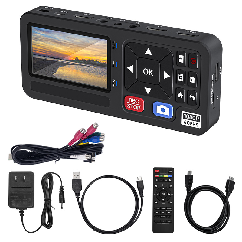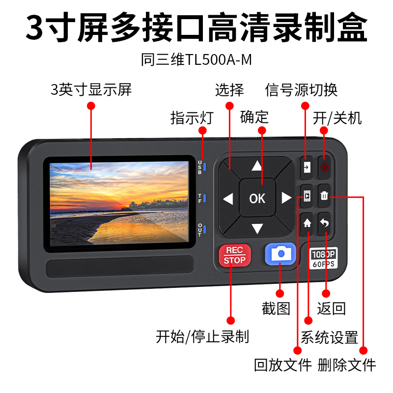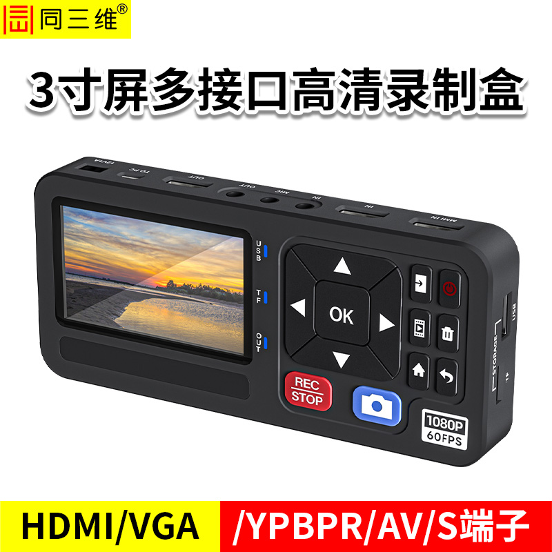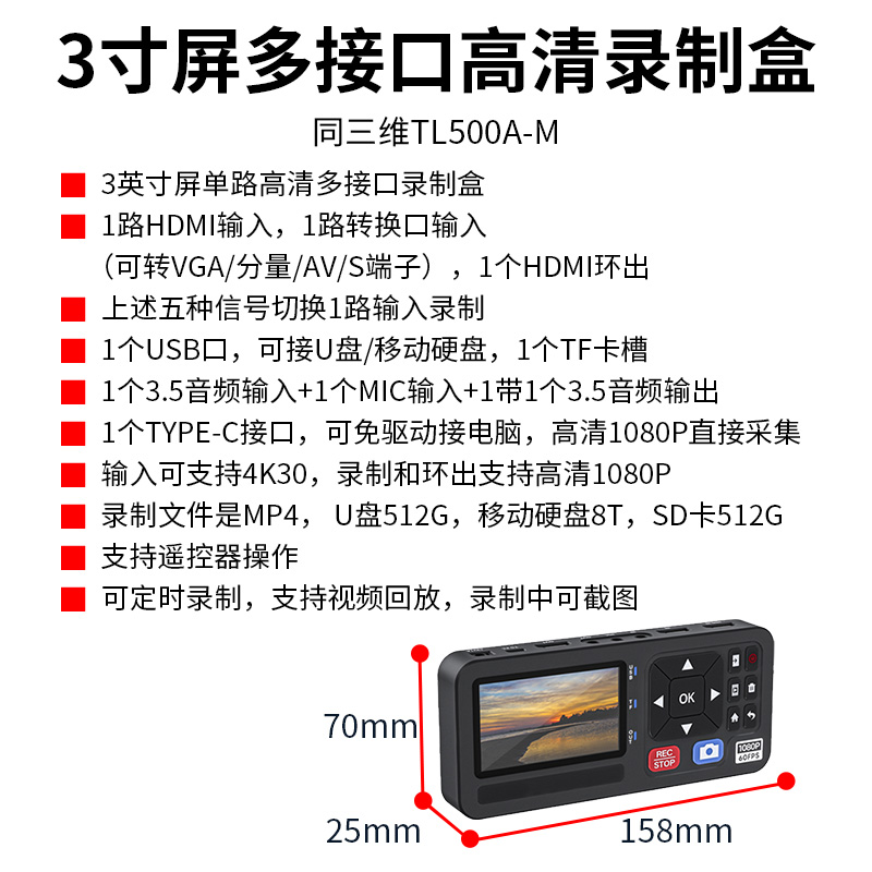 带3英寸屏,1路HDMI/VGA/分量/AV/端子信号输入,五种信号切换输入录制,1路HDMI输入,1路转换口(可转VGA/分量/AV/S端子)输入,1个USB口,可接U盘/移动硬盘,1个TF卡槽,1个3.5音频输入+1个MIC输入+1带1个3.5音频输出,1个HDMI环出,1个TYPE-C接口,支持UVC输出到电脑,电脑可高清1080P直接采集,输入可支持4K30,录制和环出支持高清1080P,录制文件是MP4, U盘支持 512G,移动硬盘支持8T,SD卡支持512G)。支持遥控器操作,可定时录制。支持视频回放,录制中可截图