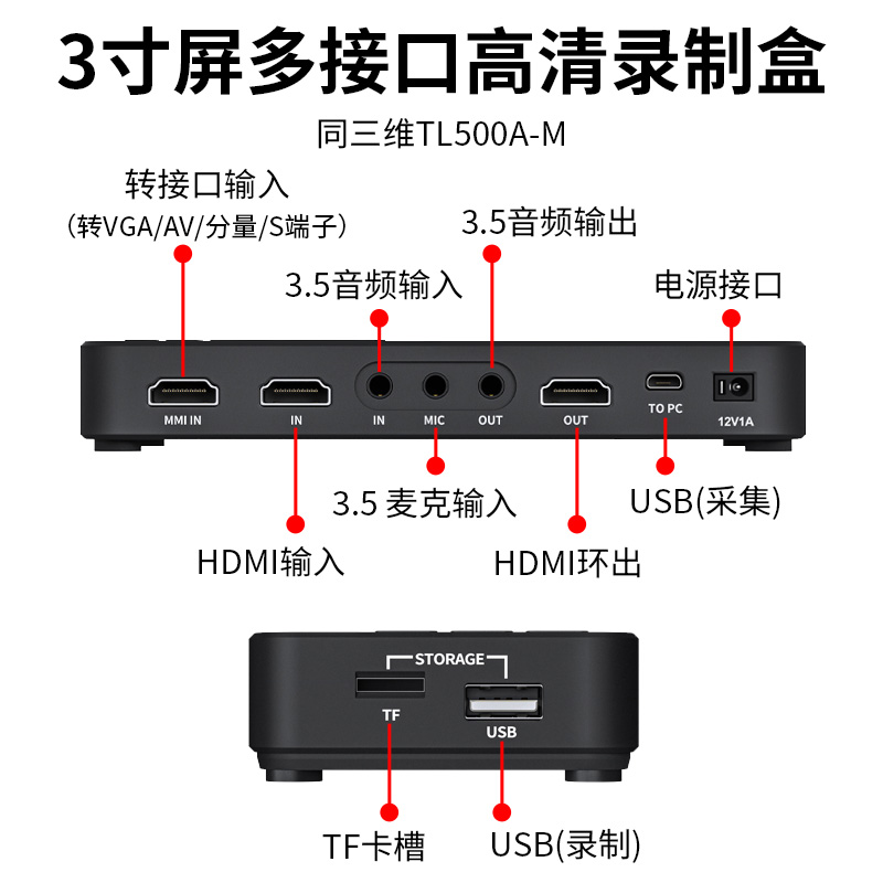 1路HDMI/VGA/分量/AV/端子信号输入,五种信号切换输入录制,1路HDMI输入,1路转换口(可转VGA/分量/AV/S端子)输入,1个USB口,可接U盘/移动硬盘,1个TF卡槽,1个3.5音频输入+1个MIC输入+1带1个3.5音频输出,1个HDMI环出,1个TYPE-C接口,可免驱动接电脑,高清1080P直接采集,输入可支持4K30,录制和环出支持高清1080P,3英寸屏,录制文件是MP4, U盘支持 512G,移动硬盘支持8T,SD卡支持512G),支持遥控器操作,可定时录制。支持视频回放,录制中可截图