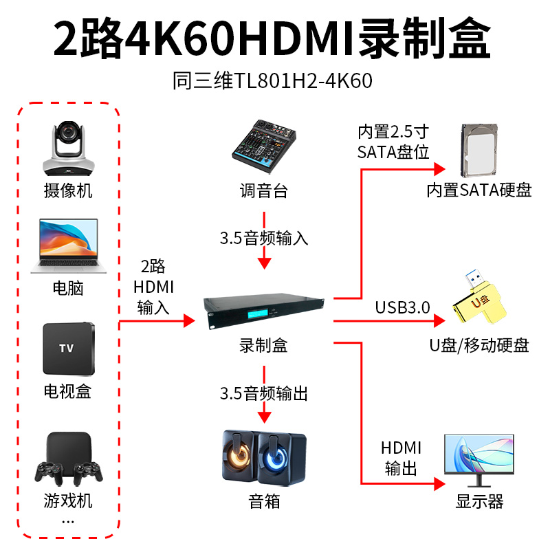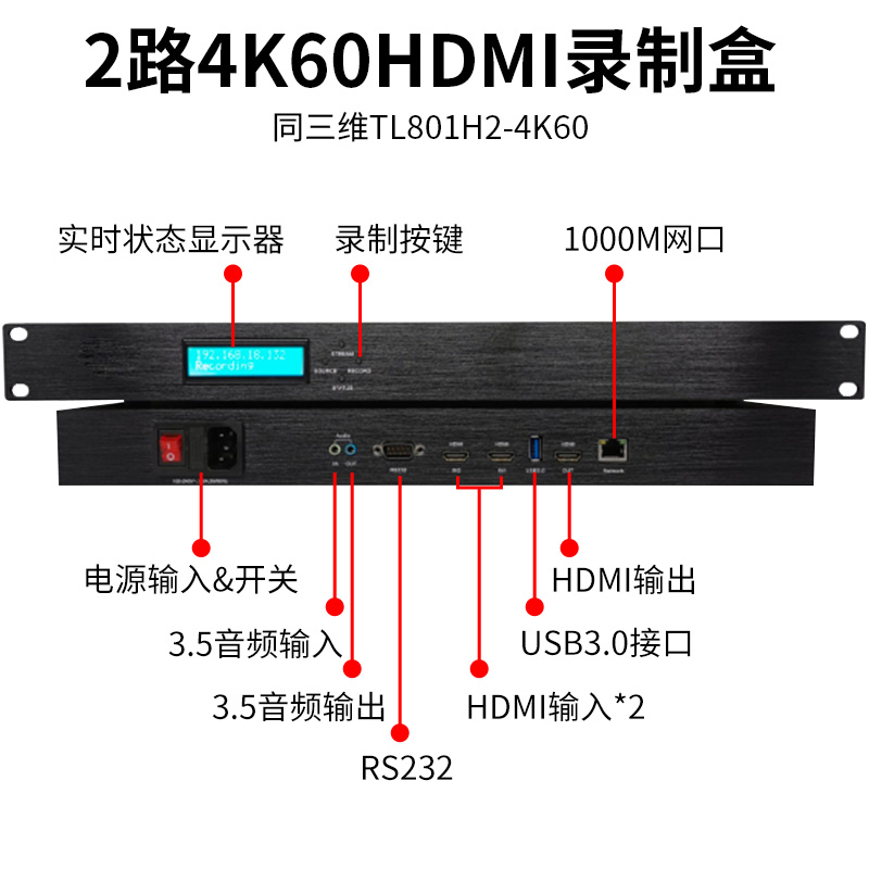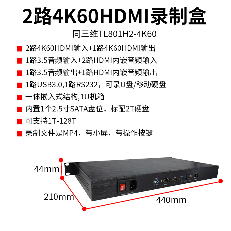 同三维TL801H2-4K60 双路4KP60HDMI录制盒, 2路4KP60HDMI录制,采用双路4K60HDMI录制盒,2路4K60 HDMI输入,1路4K60 HDMI输出,1路USB3.0,带1个RS232控制串口,1个3.5音频输入+2路HDMI内嵌音频输入,1个3.5音频输出+1路HDMI内嵌音频输出,内置1个2.5寸SATA盘位,可录U盘/移动硬盘/硬盘,带相关操作按扭,1U机箱。