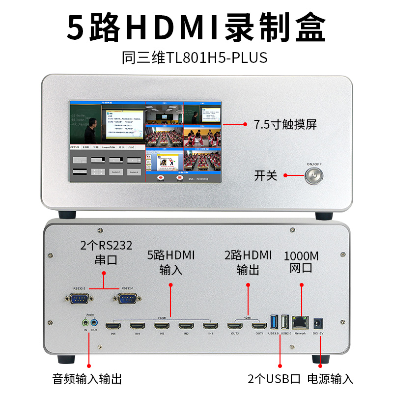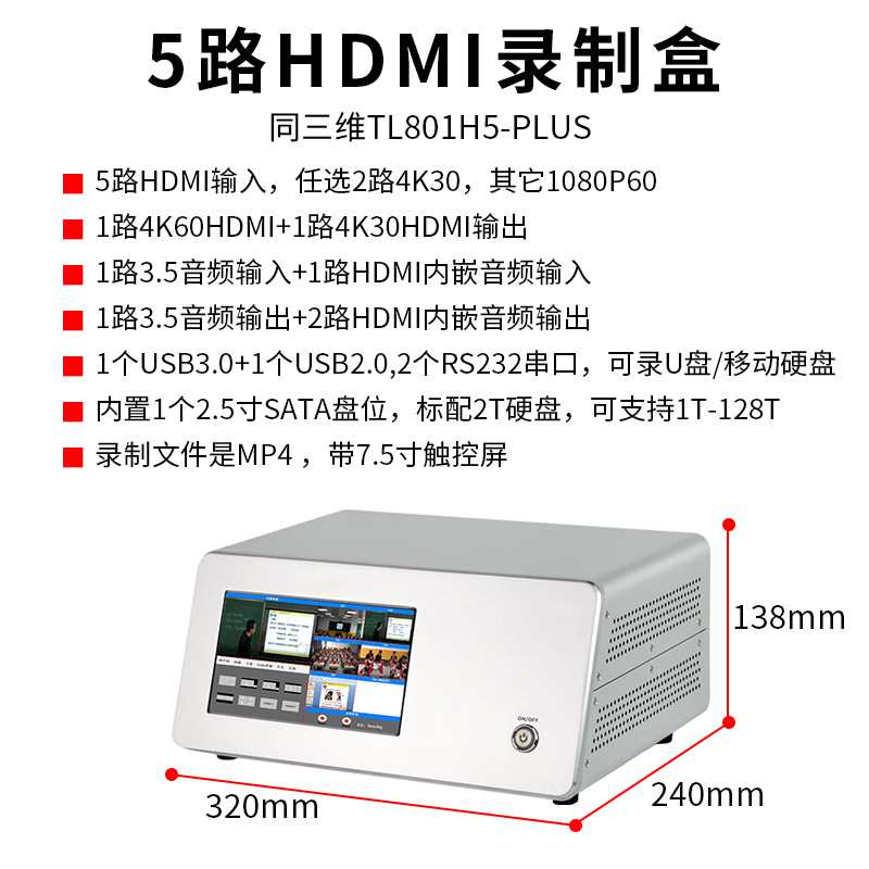 同三维TL801H5-PLUS是一款高度集成显示5路HDMI录制盒,内嵌7.5寸触摸屏、支持5路hdmi物理信号,任选2路支持4K30,其它支持高清1080P60,、1路4K60HDMI+1路4K30HDMI输出,1个3.5音频输入+1路HDMI内嵌音频输入,1个3.5音频输出+2路HDMI内嵌音频输出,内置1个2.5寸SATA盘位,1个USB3.0+1个USB2.0,2个RS232串口,支持U盘/移动硬盘/硬盘录制,支持内置SATA+USB3.0双盘录制并支持录制文件掉电保护。