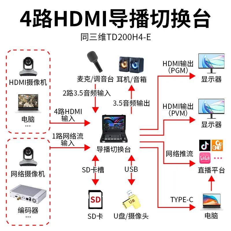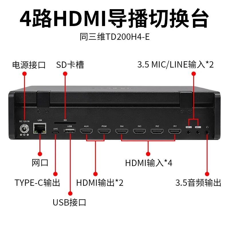 同三维TD200H4-E是一台拥有四路HDMI (其中HDMI IN1、2两路支持4K60p输入,HDMI IN3、4两路支持1920×1080p60输入;和1路USB 2.0输入(USB-A用于视频编码储存、摄像头、LOGO图片、固件升级等),1路HDMI PGM+1路HDMI AUX+1路USB 3.1(Type-C)和1路RJ45网络推流的视频切换台。