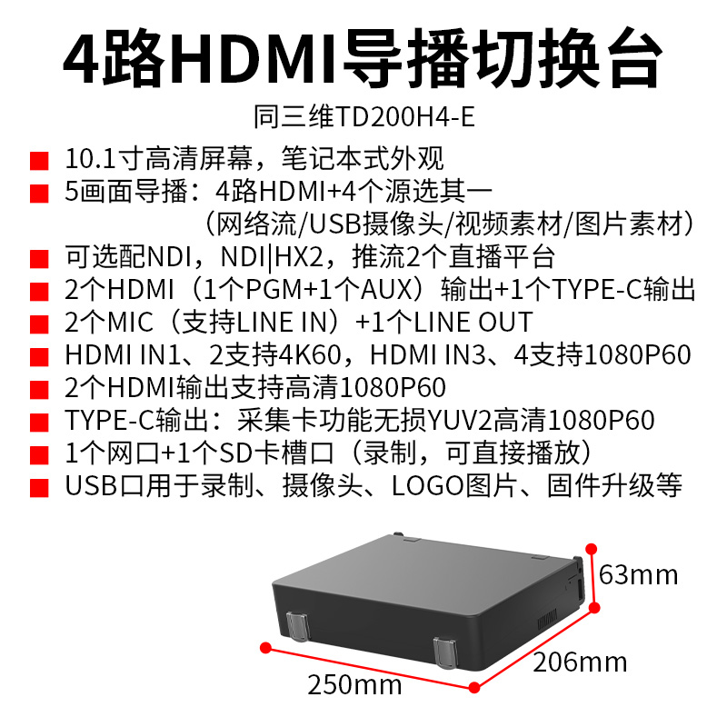 10.1寸高清屏幕,选配NDI,NDIIHX2,4路HDMI输入+1路USB2.0输入/1路网络解码拉流/视频素材输入+1路图片素材输入+2个MIC(支持LINE IN),2个HDMI(1个PGM+1个AUX)输出+1个TYPE-C输出(USB采集卡功能,无损输出,支持YUV2 1080P60)+1个LINE OUT,其中HDMI IN1、2两路支持4K60p输入,HDMI IN3、4两路支持1920×1080p60输入,两个HDMI输出支持高清1080P60, 1个网口+1个SD卡槽口(录制,可直接播放),USB口用于录制、摄像头、LOGO图片、固件升级等,同时推流2个直播平台,导播切换台+录制盒+USB采集卡+推流盒四合一