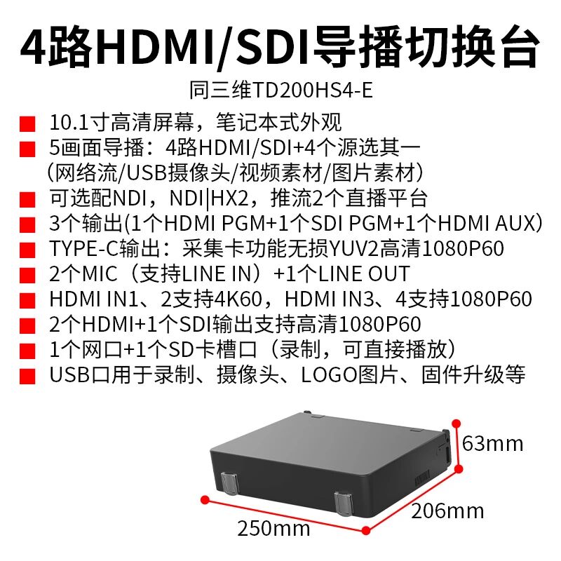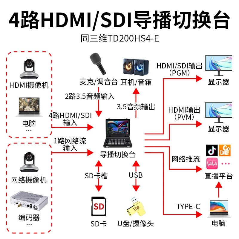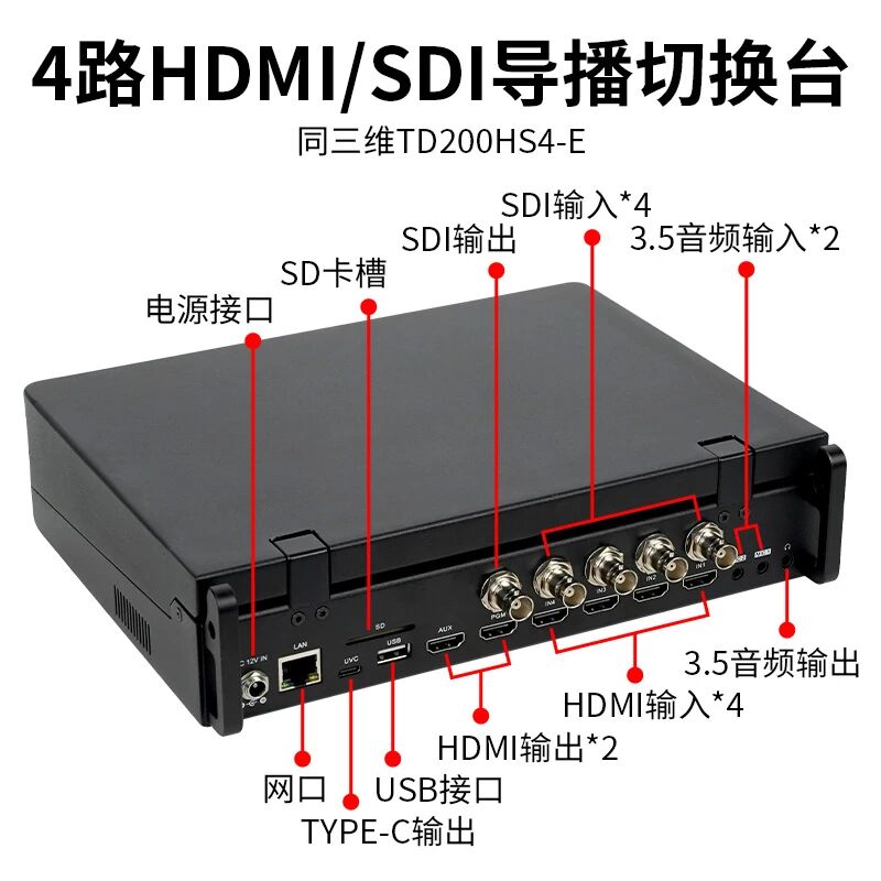 同三维TD200HS4-E是一台拥有同时选4路(4路HDMI+4路SDI)输入 (其中HDMI IN1、2两路支持4K60p输入,其它支持1920×1080p60输入;和1路USB 2.0输入(USB-A用于视频编码储存、摄像头、LOGO图片、固件升级等),2个HDMI+1个SDI输出支持高清1080P60,1路USB 3.1(Type-C)和1路RJ45网络推流的视频切换台。