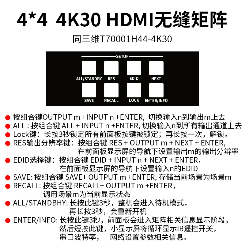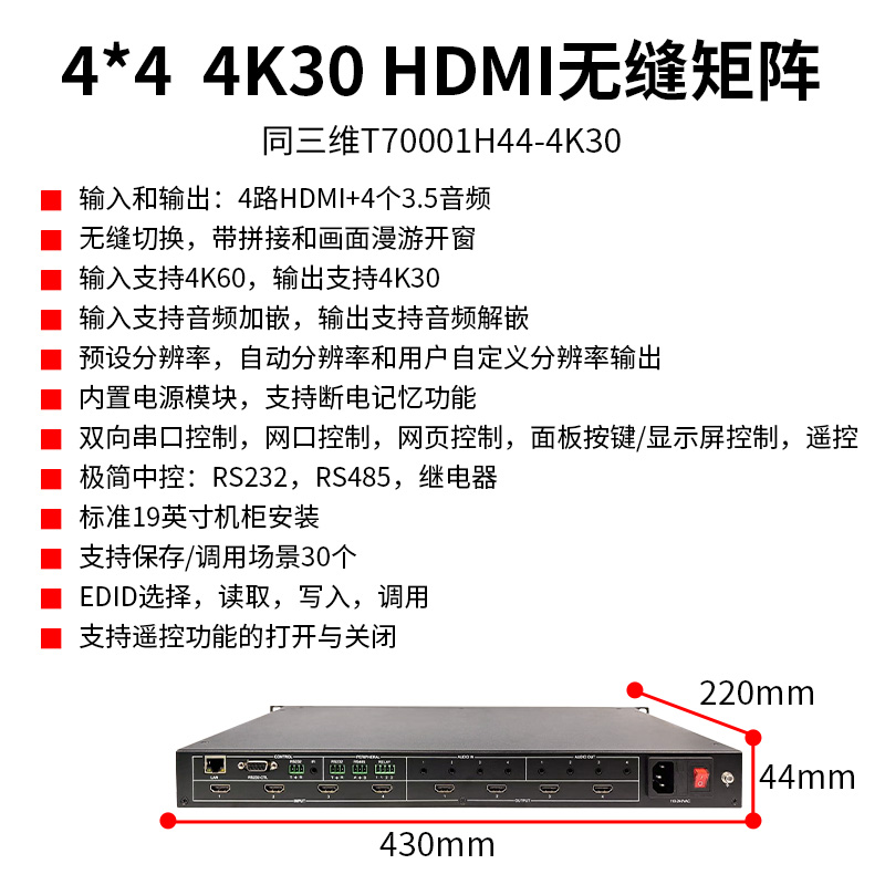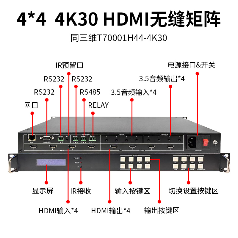 同三维T70001H44-4K30 HDMI 4x4无缝切换矩阵是一款高性能的超高清视频信号交换设备,支持 4K@30Hz 视频信号的输入,输出,切换以及拼接, 开窗等处理。