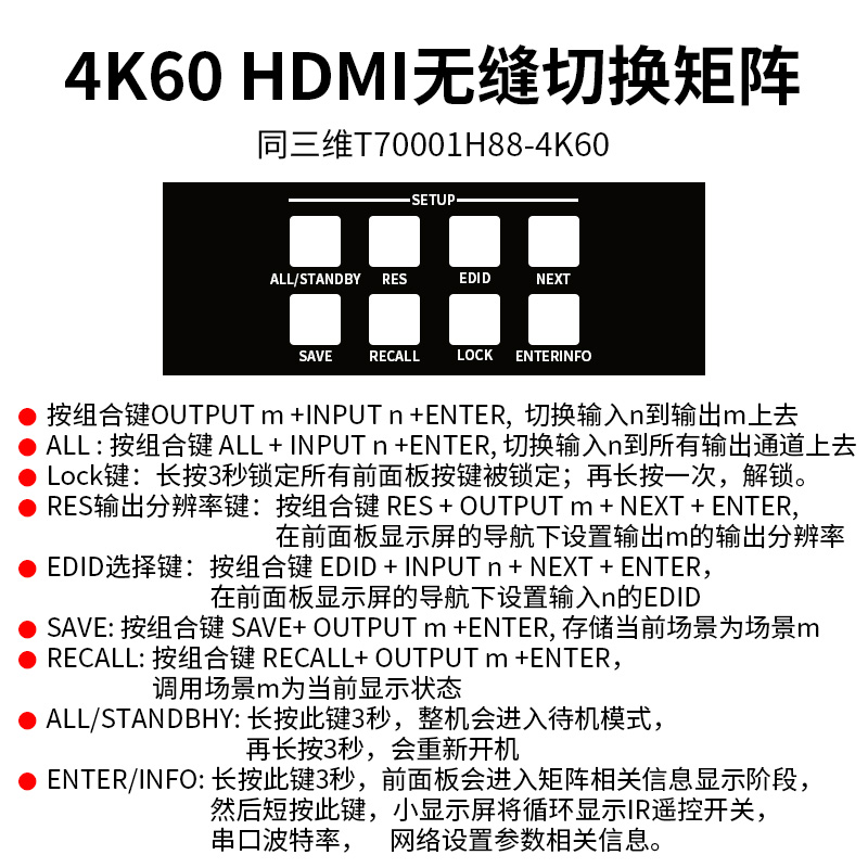 8. ALL : 按组合键 ALL + INPUT n +ENTER, 切换输入n到所有输出通道上去