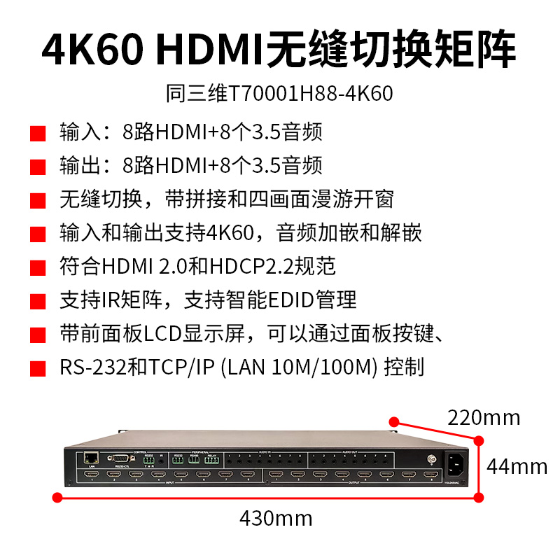 同三维T70001H88-4K60HDMI 8x8无缝切换矩阵是一款高性能的超高清视频信号交换设备,支持 4K@60Hz 视频信号的输入,输出,切换以及拼接, 开窗等处理。