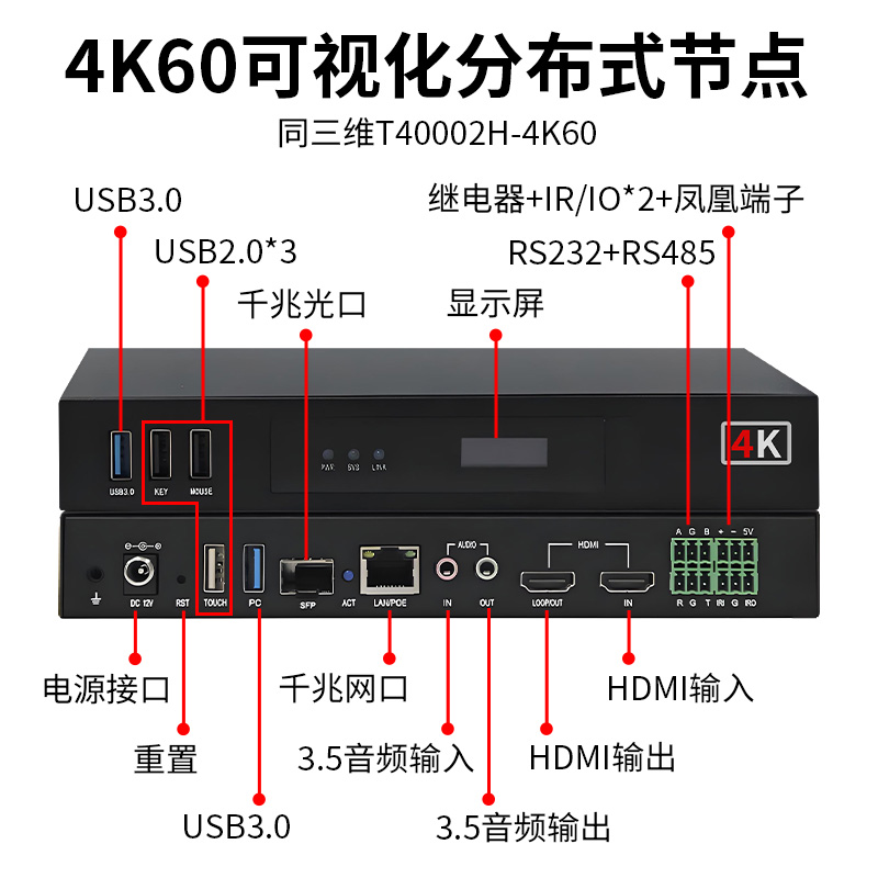 3.具备1个电源指示灯、1个系统运行指示灯、1 个网络状态指示灯、1个恢复出厂设置按键、1个接地螺孔、3个USB 2. 0接口(鼠标、键盘、触摸框等)、2路USB3.0接口(可接U盘传输)、1个千兆网口,1路千兆光口,1路HDMI视频输入和1路HDMI视频输出接口、1路3.5mm音频输入接口、1路3.5mm输出接口,1路RS232、1路RS485、1路继电器、1路IR/IO输入,1路IR/IO输出,凤凰端子;