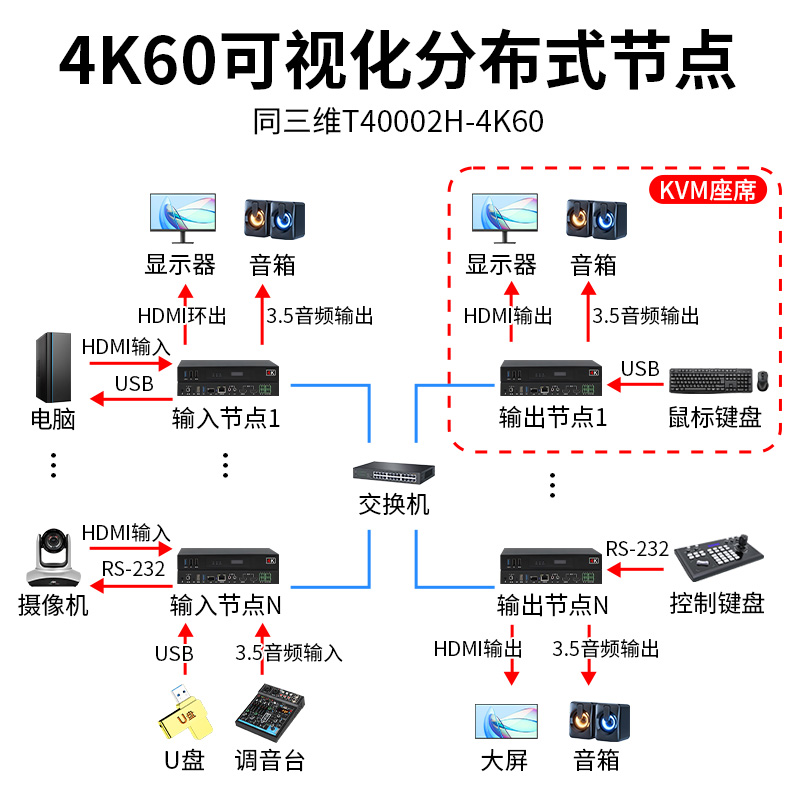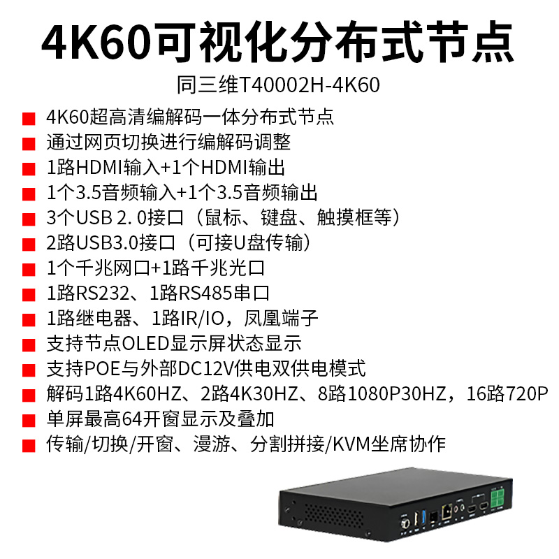 同三维T40002H-4K60分布式编解一体节点是分布式KVM坐席拼控系统的编解输入输出双向端产品,可通过按钮切换或者网页切换的方式进行编解模式调整。