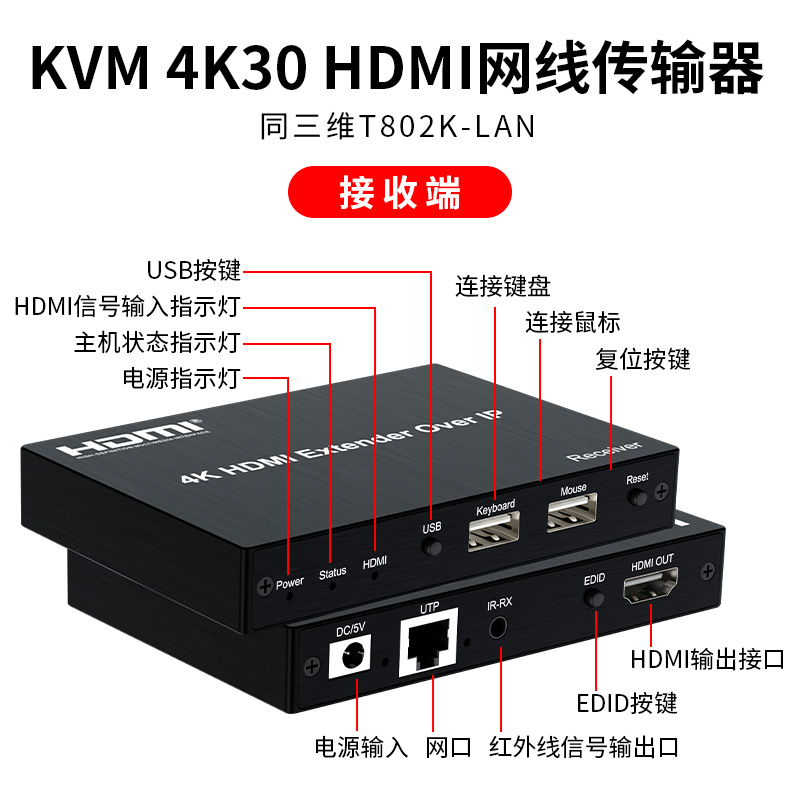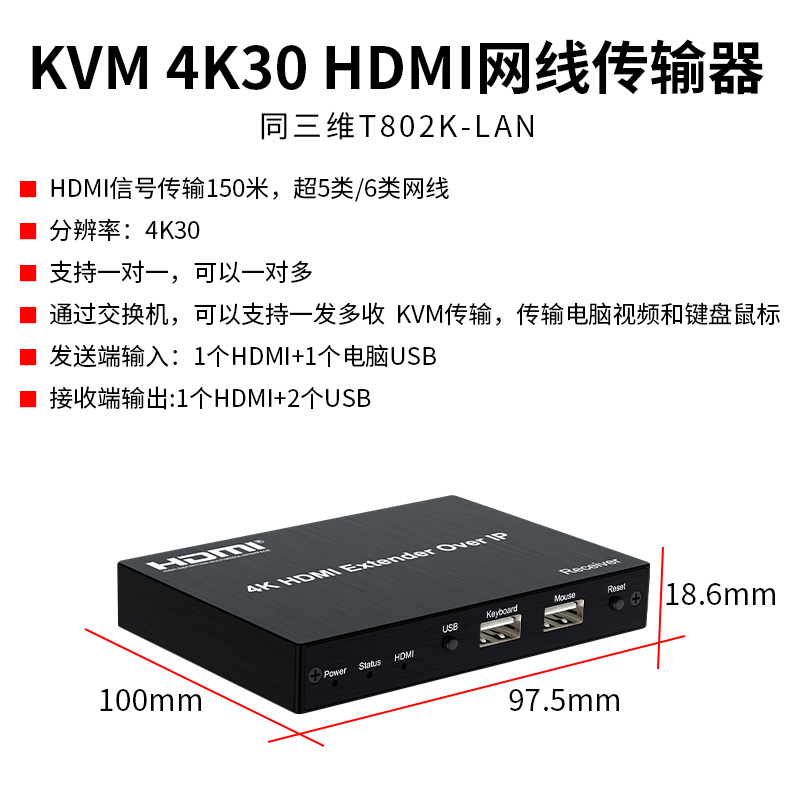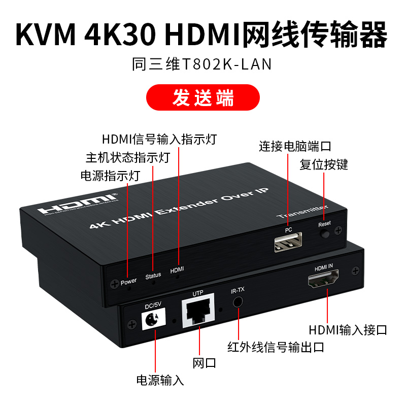 同三维T802K-LAN KVM 4K30高清HDMI网线延长器